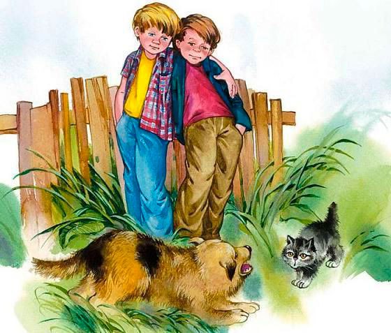 Собака люто гавкав, припадаючи на передні лапи. Прямо перед нею, притулившись до паркана, сидів маленький скуйовджений кошеня. Він широко розкривав рот і жалібно нявчав. Неподалік стояли два хлопчика і чекали, що буде.