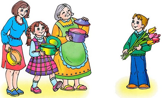 Одного разу покликали Сашу дідусь і тато: «Скоро у наших дівчаток свято. Ти допоможеш зробити їм подарунок?» - запитали вони. Саша здивувався: «яке свято?» Тато відповів: «Кращий весняне свято - Міжнародний жіночий день!» І тоді вони з дідусем розповіли історію цього свята. Сашко слухав і думав, що можна зробити для своїх дорогих бабусі, мами і сестрички.