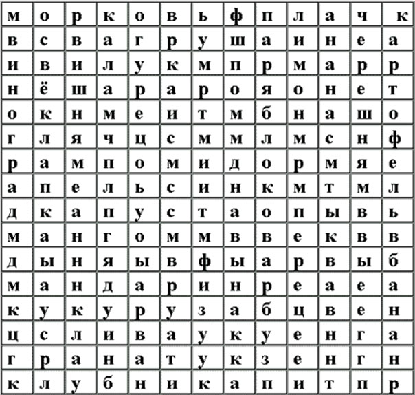 Морква, помідор, огірок, гарбуз, цибуля, капуста, апельсин, мандарин, лимон, яблуко, виноград, слива, буряк, кукурудза, перець, гранат, груша, картопля, буряк, ананас, вишня, диня, черешня, полуниця, банан, манго.
