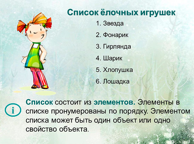 - Якщо доводиться мати справу з великою кількістю об'єктів або їх властивостей, зручно використовувати список. Маша склала список ялинкових іграшок.