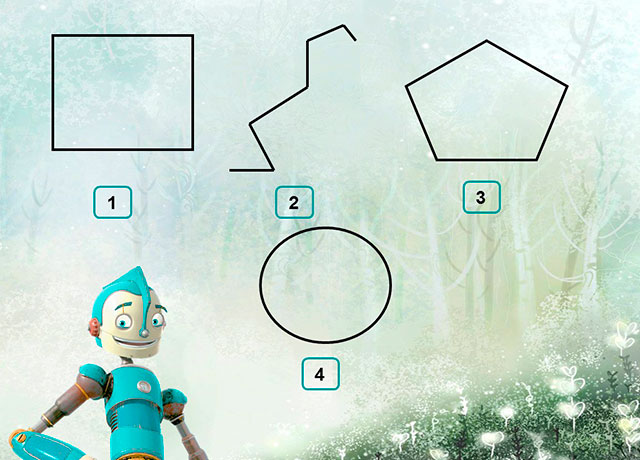 - Розгляньте малюнок. Яку властивість є у всіх об'єктів, крім одного? (Рішення 1: «У квадрата, п'ятикутника і незамкнутої ламаної є властивість, ім'я якого «число відрізків», а у окружності властивості такого немає. У квадрата це властивість має значення 4, у п'ятикутника - 5, а у ламаної, показаної на малюнку - 6.» Рішення 2: «У квадрата, п'ятикутника і кола є властивість, ім'я якого «площа», а у ламаної властивості цього немає»).
