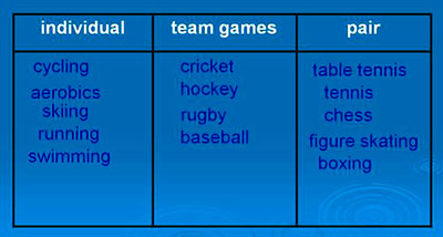 -Які види спорту популярні в Британії? В Росії? -Хокей, футбол, теніс, гольф і т.д. -Добре. Ви напевно вже помітили, що на ваших партах лежать мініатюрні прапори Британії та Росії. Візьміть їх, вони знадобляться для наступного завдання. Я буду показувати вам вид спорту, ваше завдання - підняти прапор тієї країни, в якій цей вид спорту популярний і назвати його по-англійськи. Можуть бути і такі види спорту, які популярні в обох країнах. Готові? Тоді починаємо! -Great. What three groups we can divide all sports into due to the number of players? -Individual, team games and pair. -Yes, you are right. Let's divide these words into 3 boxes