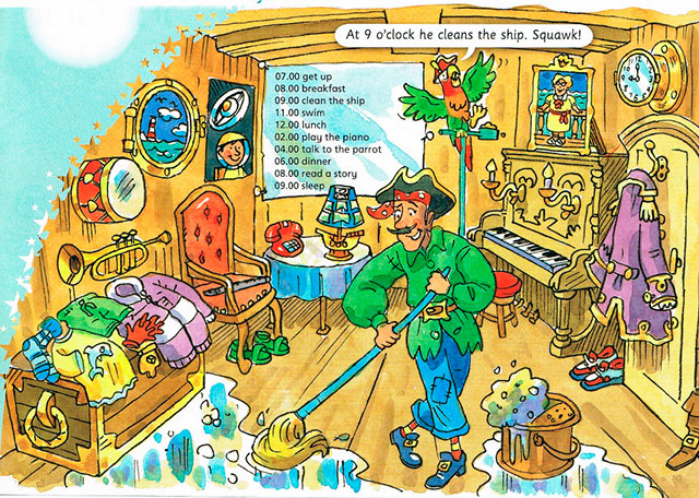 6. Подивися на картинку і скажи, що пірат Jack робить кожен день і у який час: