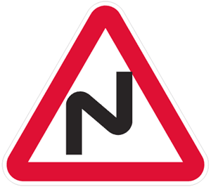 Подвійний вигин лінії на знаку «Небезпечні повороти» попереджає водіїв про те, що попереду дорога робить кілька крутих, небезпечних поворотів. Отже, необхідно бути дуже обережним.