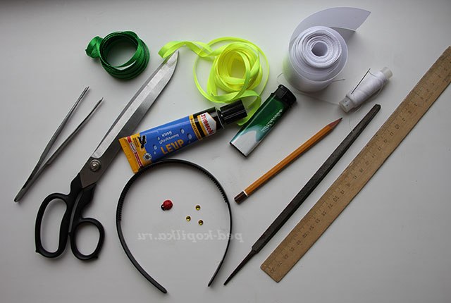 10) Дві стрічки атласних різних кольорів шириною 0,6 см , довжиною 120 - 150 см для обплітання обідка