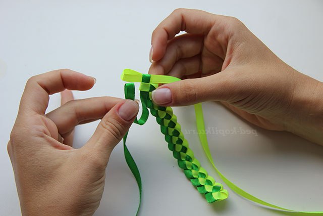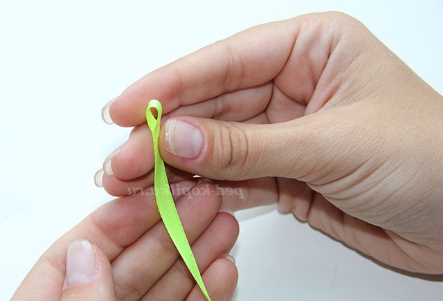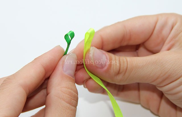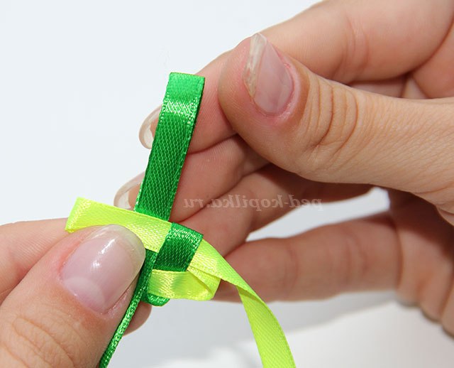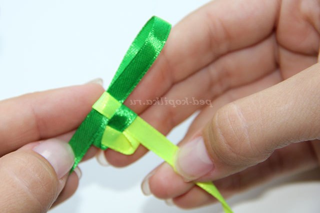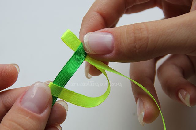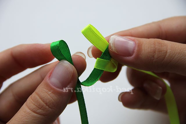 3) Повертаємо стрічки обличчям до себе і протягуємо темно-зелену стрічку через петлю світло-зеленою.