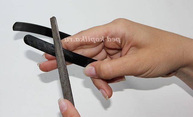 7) Напилком злегка знімаємо глянсову поверхню обідка для кращого приклеювання нашої кіски.