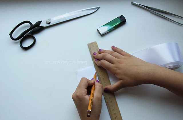 І нарізаємо білу стрічку квадратами по 5 см на 5 см - 8 штук. Це заготовки пелюсток.