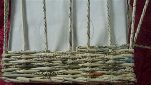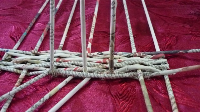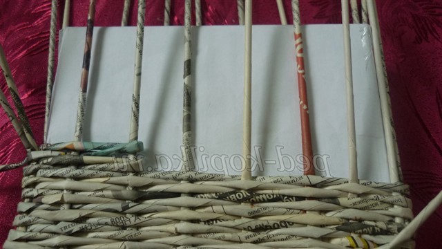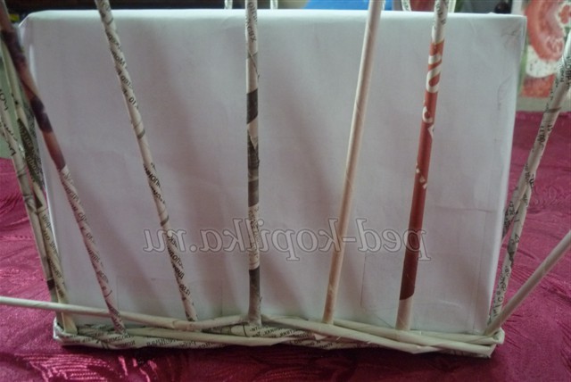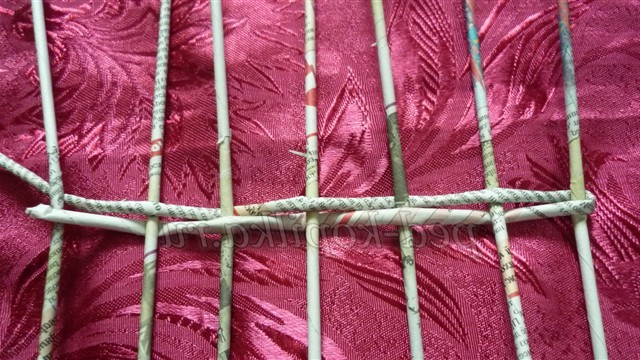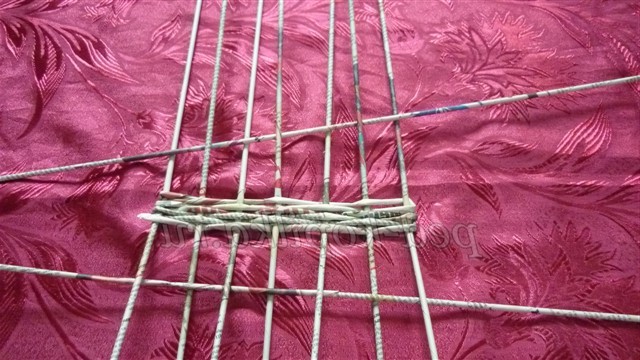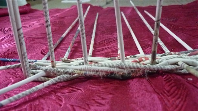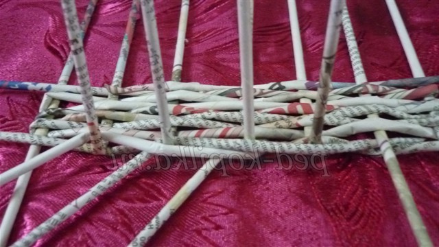 Розкладаємо їх на столі - це будуть основины, і починаємо плетіння робочої трубочкою простим плетенням, огинаючи стоячі трубочки по черзі перед основиной і за основиной. Дійшовши до останньої основины, огинаємо робочої трубочкою і продовжуємо плетіння, змінюючи розташування робочої трубочки в шаховому порядку (якщо вона була перед основиной, то тепер за неї)