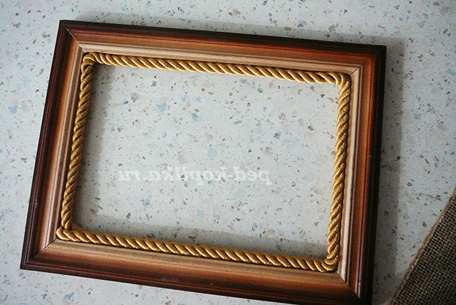 Виріб перебувала в духовці 2 години при температурі 150проС. Тепер можна зайнятися рамкою. Купила в магазині рамочку, по краю подклеила декоративний шнур. Підготувала шматок мішковини.