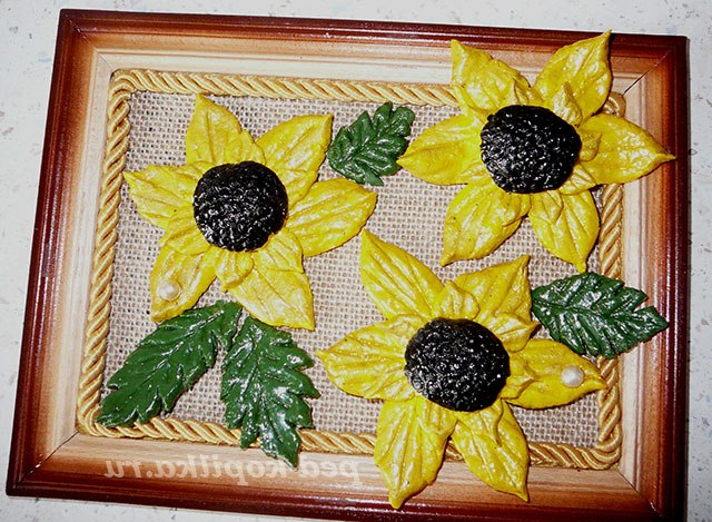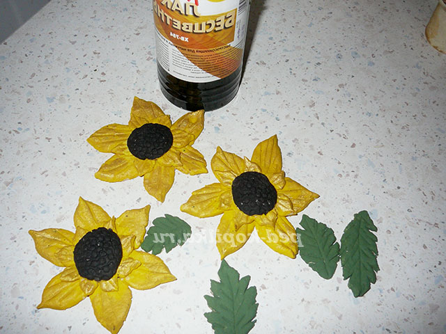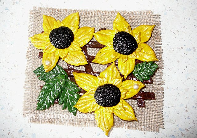 Змочивши зворотний бік водою, накласти серединку. Квітка готовий. Таким же чином виконуємо ще два подсолнушка.