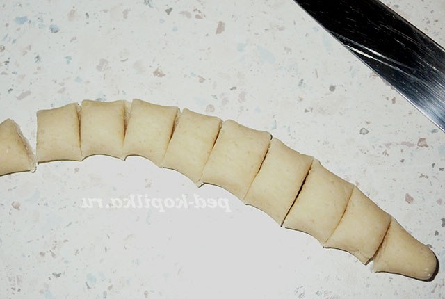 Беремо невеликий шматок тіста розкачуємо рівний валик, який разрежем на кілька рівних частин.