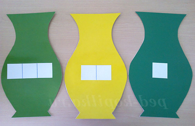 9. Із білого картону вирізаємо квадрат з довжиною сторони 4 см і прямокутник, розділені на 2, 3 частини - це схеми слів, що вказують на кількість складів у слові; наклеюємо деталі на вази.