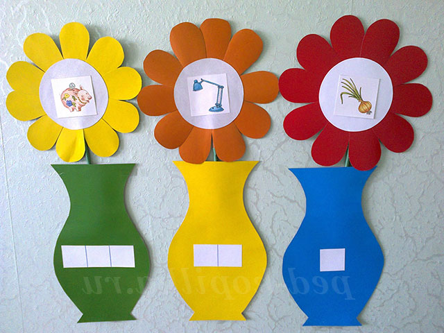 Опис: На вазах розташовані схеми, які вказують на кількість складів у слові (від 1 до 3). На квітах предметні картинки, з різною кількістю складів у їх назві. Діти повинні визначити кількість складів у назві картинки і поставити квітку в потрібну вазу.
