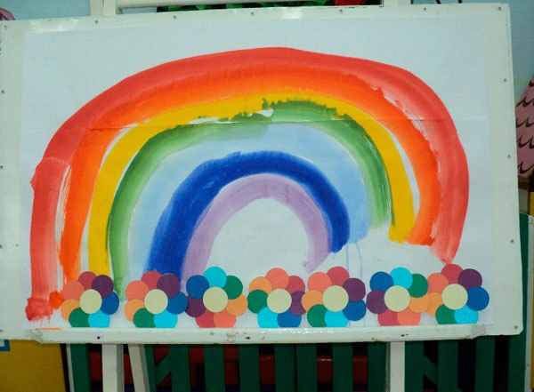 Потім квіти вивішують під зображенням веселки намальованою дітьми.