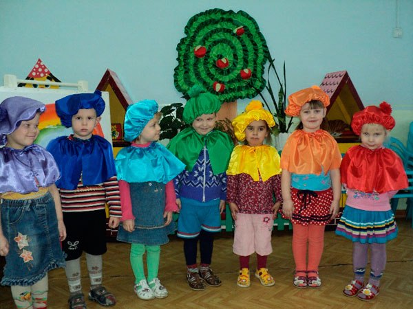 Давайте уявимо, що зараз йде дощ. Ви сидите біля вікна, дивіться і слухати шум дощу. І ви, напевно, почуєте різні звуки, різні голоси. (Входять діти в костюмах фарбочок)