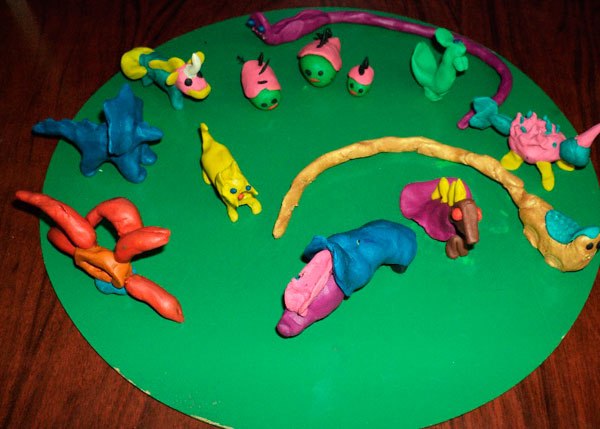 На одній планеті - вона називалася "Рис-З" - були дуже погані метеорологічні умови. Там кожен день з неба падали метеорити або камені. Тому всі тварини цієї планети мали панцир, зовсім як наші черепахи. Спробуйте разом з мамами за допомогою пластиліну та шкаралупи волоського горіха зробити фігурки цих тварин. А ось як вони називаються, ми дізнаємося вибравши картку з назвою тварини.