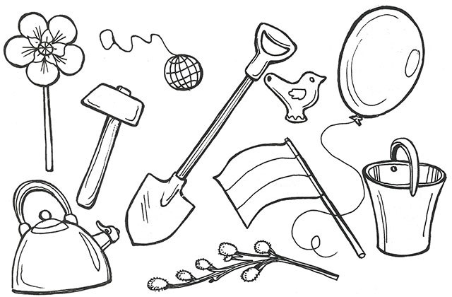 ❖ З усіх предметів, намальованих на картинках, вибери ті, які потрібно брати на першотравневу демонстрацію.
