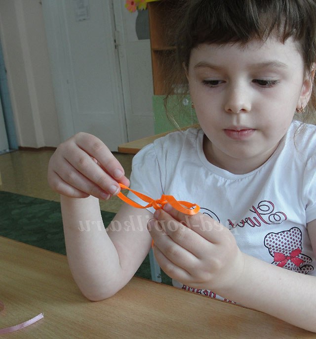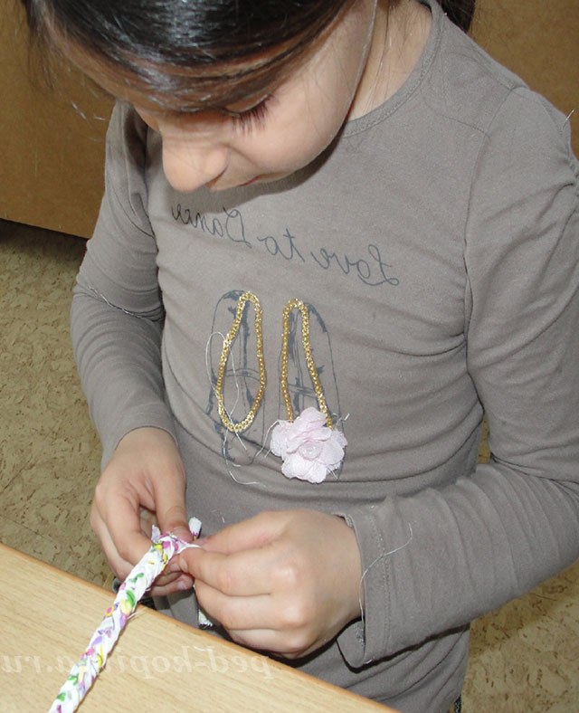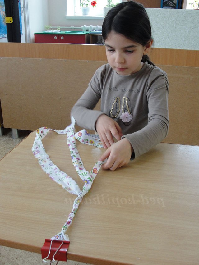 2. Закріплюємо за 3-і смужки тканини будь-яким зручним для дітей способом: -крабиком або скотчем до столу, шпильками до поролоновою подушці.