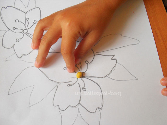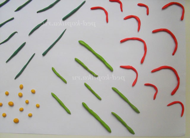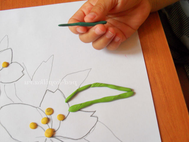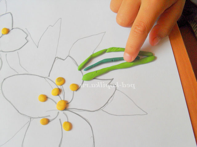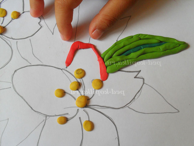 Відкатали кульки з жовтого пластиліну для середини квітки і тичинок; з зеленого пластиліну ковбаски для листочків; підготували з червоного пластиліну ковбаски для пелюсток.