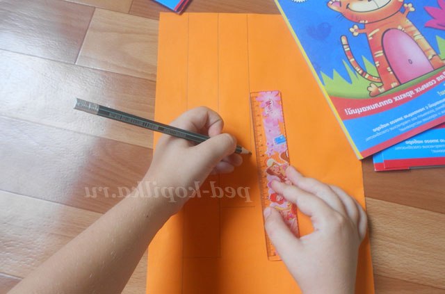 2. Вибираємо різнокольоровий папір і за допомогою лінійки і простого олівця відміряємо три смужки шириною в