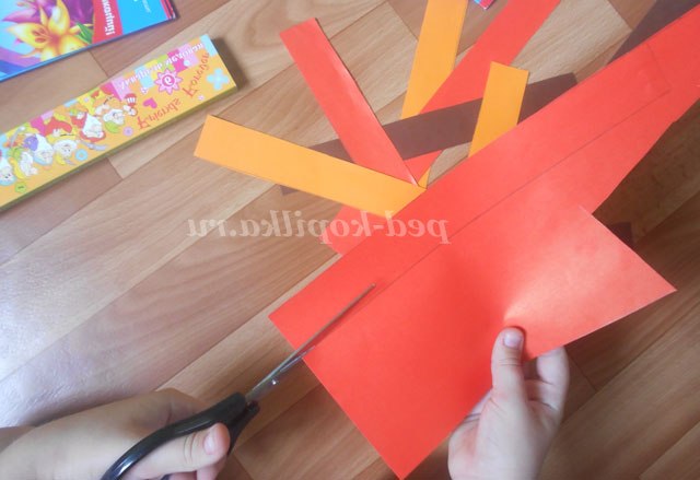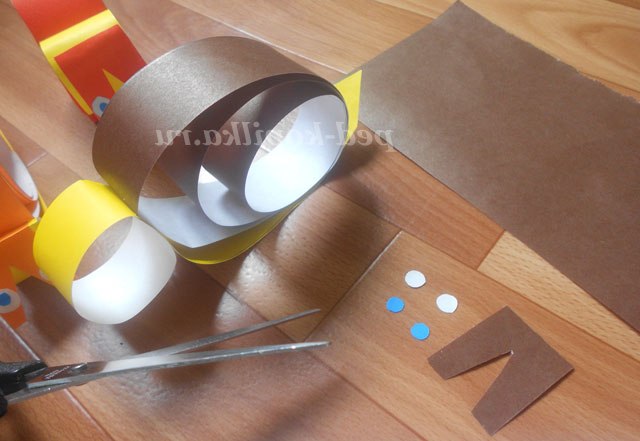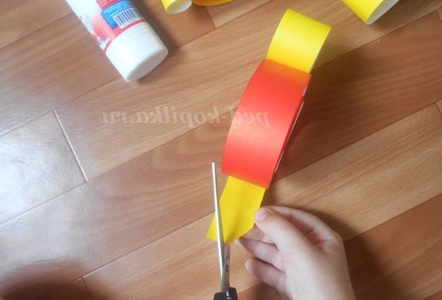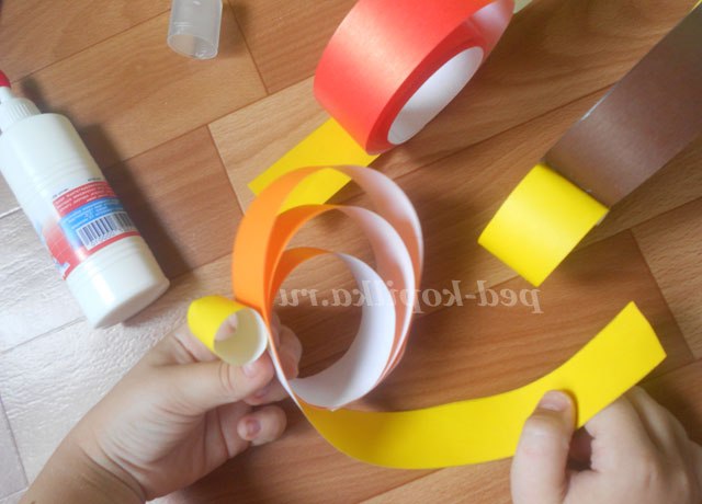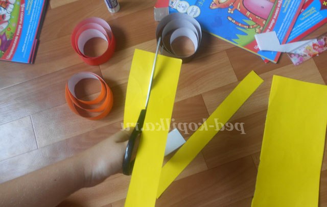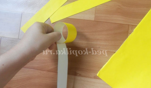 8. Приступаємо до виготовлення тулуба наших равликів : для цього з жовтого паперу вирізаємо три однакових по довжині смужки шириною