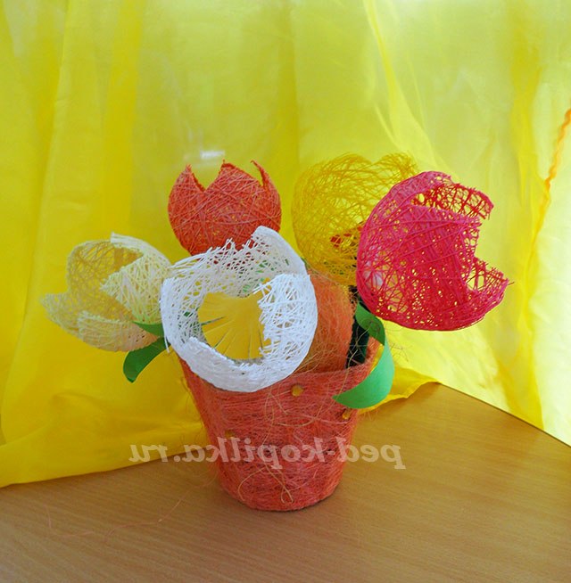 З дітьми підготовчої групи дитячого саду можна змайструвати ось таку вазу з квітами. Така ваза стане відмінним подарунок мамі, бабусі, а також чудовою прикрасою інтер'єру дитячого садка у весняний і літній періоди.