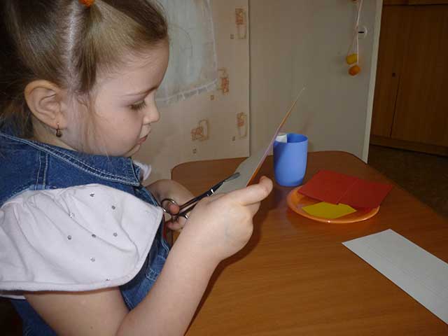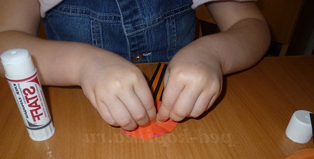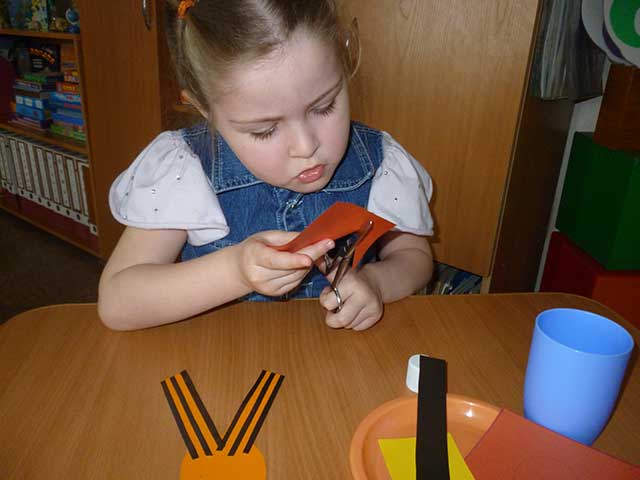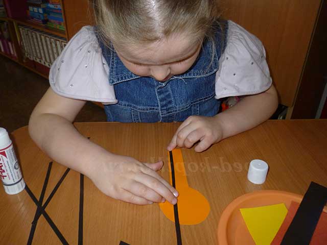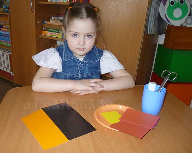 Матеріали: аркуш помаранчевого картону, смужка кольорового паперу чорного, жовтого і червоного кольору.