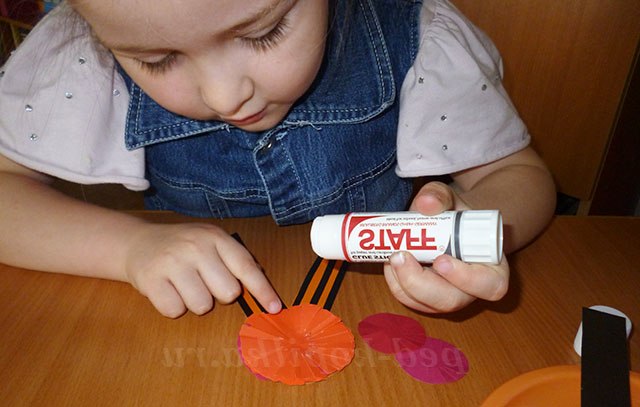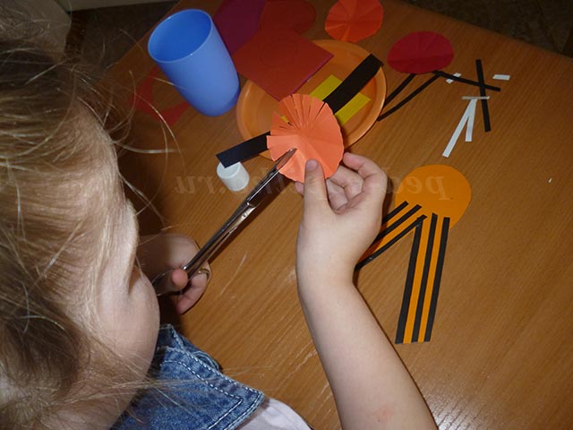 4. З паперу червоного кольору вирізати 3 кола, зробити надрізи до середини. Наклеїти на готовий шаблон.