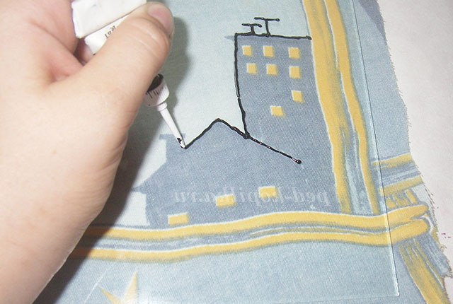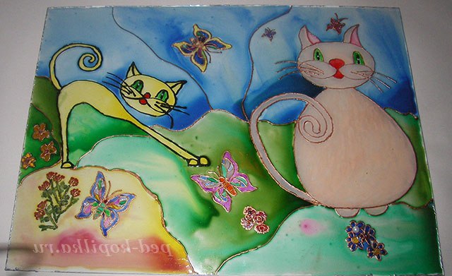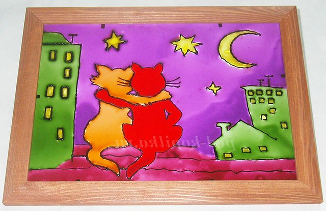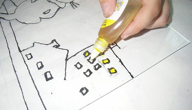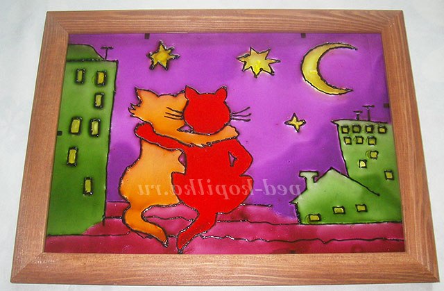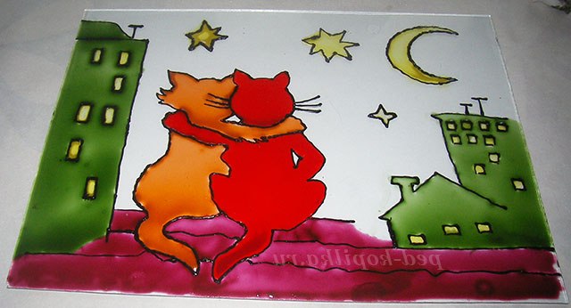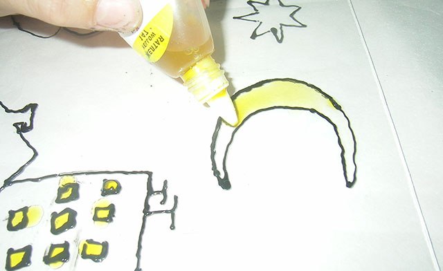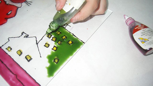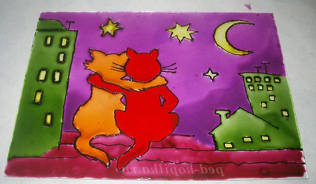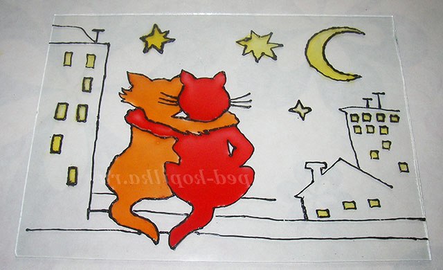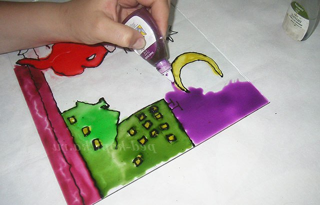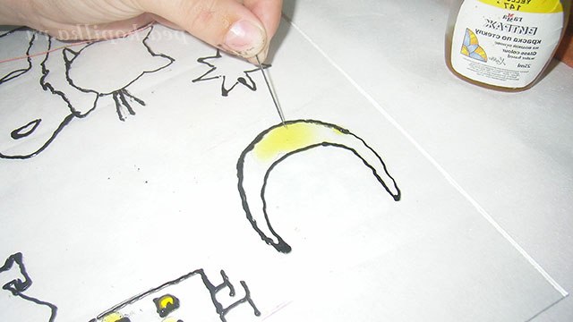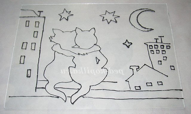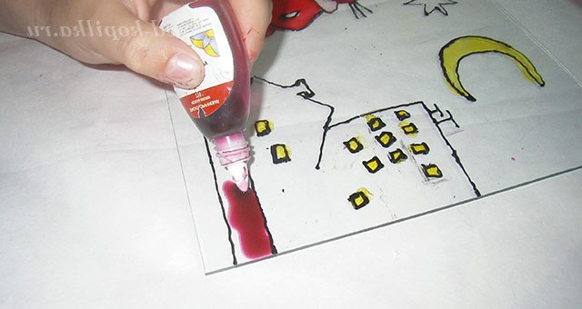 4 крок: залити вітражного фарбою з тюбика малюнок всередині (сильно на тюбик не тиснути фарба сама витікає), якщо утворюються бульбашки, проткнути голкою. По черзі зафарбовувати спочатку деталі малюнка (кішки, вікна, будинку, зірки), після кожного етапу, дати фарбі висохнути. Там, де тонкий шар фарби - малюнок світлішим.