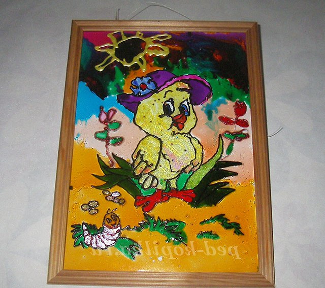 За вітражем легко доглядати протирати від пилу вологою ганчіркою фарби не змиваються - роботи довговічні. Дитячі роботи в техніці вітраж чудово виглядають в інтер'єрі групи, так і вдома: вони самобутні, своєрідні і мають чарівністю. Крім того, це прекрасний подарунок.