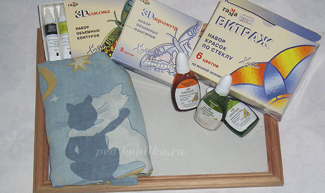 Матеріал для роботи: для роботи потрібно фоторамка зі склом, картинка або ескіз майбутньої картини (ідеї можна брати з журналів, разукрашек, малюнки на одязі.....мені сподобався малюнок на постільній білизні, можна брати фрагменти і створювати свою композицію), вітражні фарби, контурні фарби.