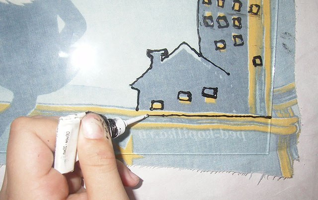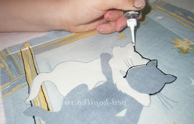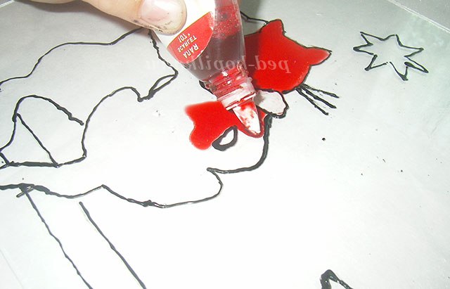3 крок: контурами з тюбика (можна використовувати будь-який колір) перенести малюнок з ескізу на скло, контур повинен бути об'ємним - тонка акуратна «ковбаска», почекати поки висохне, (якщо дитина допустив деякі помилки, засмутився легко поправити свіжу фарбу ватяними паличками, коли висохне акуратно зчистити - голкою); для малюків контур завдає дорослий.