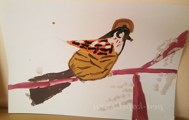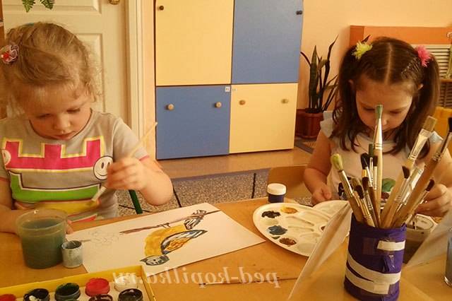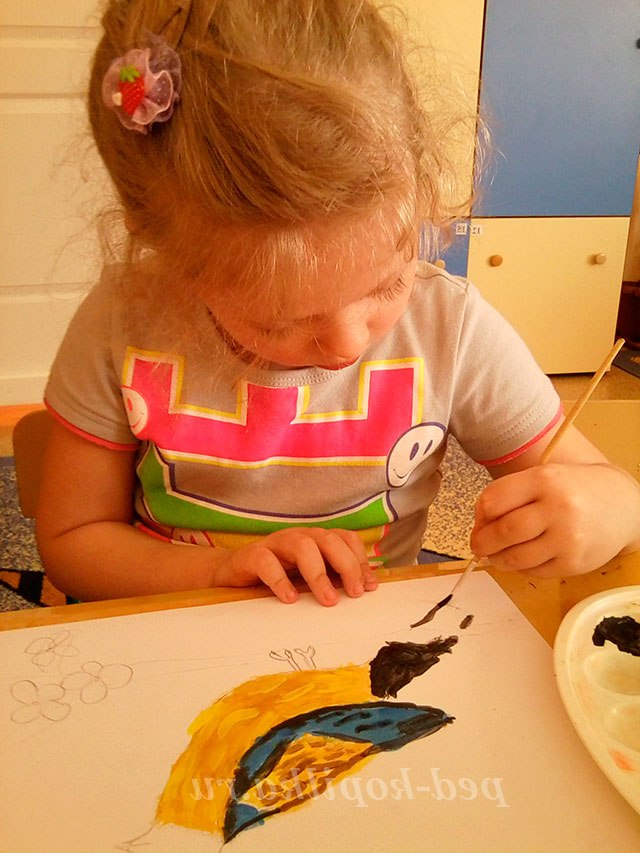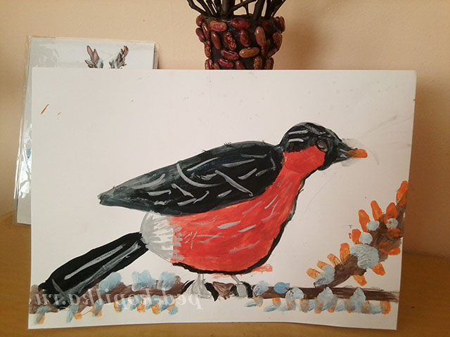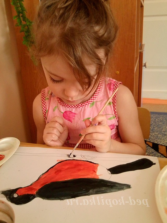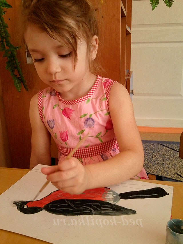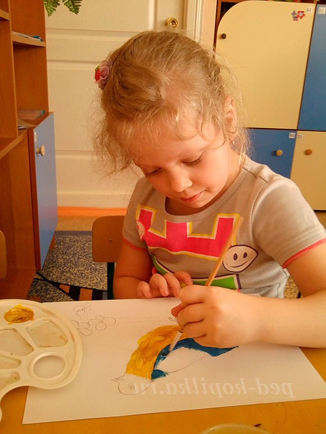 Під час роботи педагог розмовляє окремо з кожним про фарбуванні птиці, за необхідності радить які фарби краще змішати між собою для отримання потрібного відтінку. Працюючи самостійно у дітей з'являється можливість експериментувати.