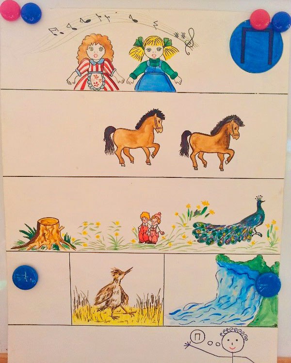 Побіжить він по дорозі. (Потім пропевание складів: з м'яким звуком співають діти з зеленими гумками; з твердим звуком - з синіми гумками)