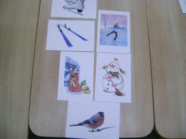 Матеріал та обладнання: ноутбук, ялинка, сніжок, слайди, новорічна листівка, картинки про зиму, мішечок з новорічними іграшками, магнітофон, аудіозапис (звуки кришталевого дзвіночка), промінчики від сніжинки з різнокольоровими словами.