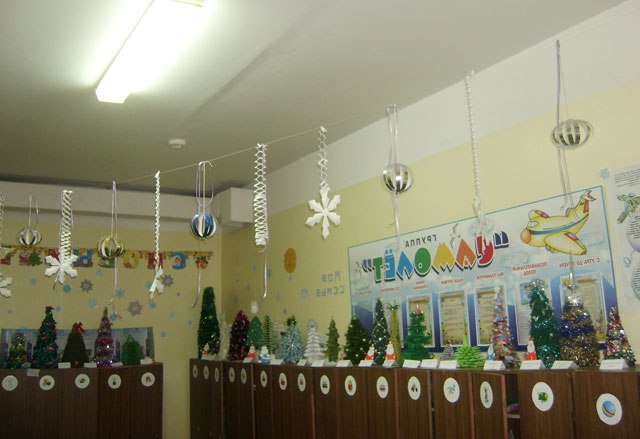 Діти: Ялинки різної висоти, сріблястого й зеленого кольору. Найвища ялинка, прикрашена новорічними іграшками. Перед ялинкою стоять два стільці, для Діда Мороза і Снігуроньки. В кімнаті ялинок, є подарунки для дітей, м'які іграшки.