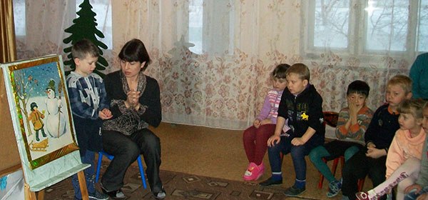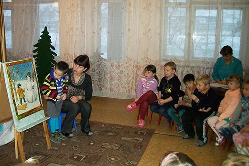 «Вийшов хлопчик Саша у двір і побачив великого сніговика. Саша дивиться і дивується. Звідки він тут узявся? А сніговика зліпили діти з дитячого садка під час прогулянки».