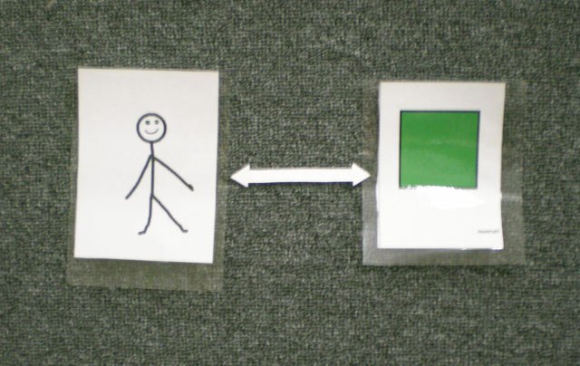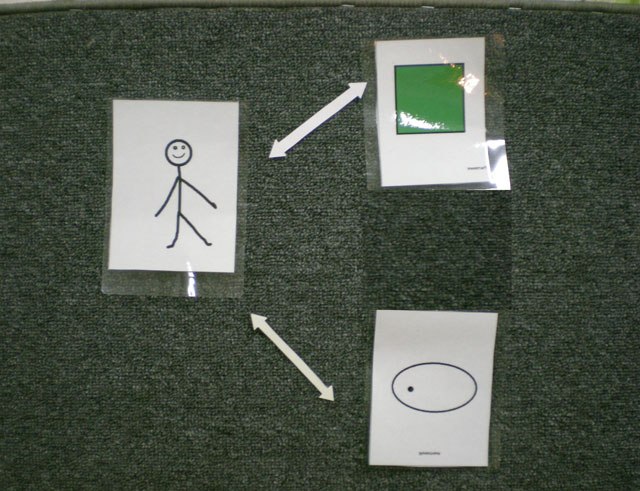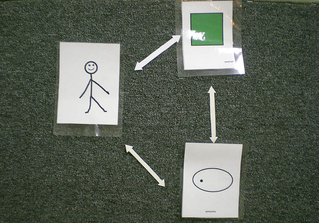 Картинки з зображенням мешканців лісу (ведмідь, заєць, дятел; осика, береза, сосна, дуб), луки (бджола, джміль, жук, польова миша; конюшина, ромашка, волошка), водойми (риби, жаби, бабка; водорості, латаття, очерет), міста (голуб, ворона, собака; клен, чагарники, тополя). Умовні позначення ліси, луки, водойми, міста, тварин, людини.